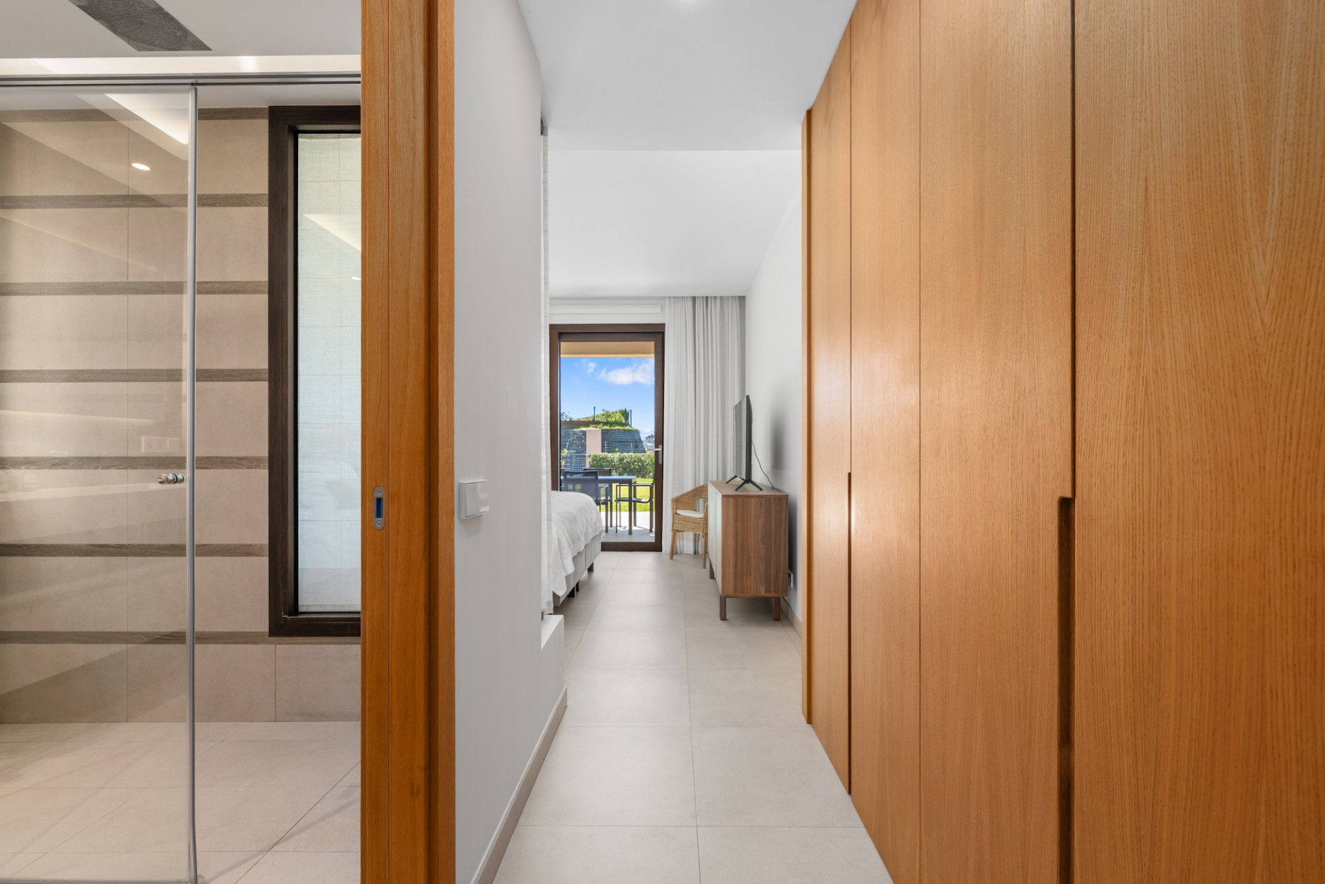 The layout was designed for privacy: a night hall serves the different spaces. It opens onto a spacious master suite with direct garden access and an en-suite bathroom, as well as two other generous bedrooms sharing a modern shower room. Each bedroom benefits from electric shutters and large built-in wardrobes. A laundry room / guest toilet completes this functional ensemble. Comfort is absolute thanks to the full underfloor heating and reversible air conditioning, both independently adjustable in each room.