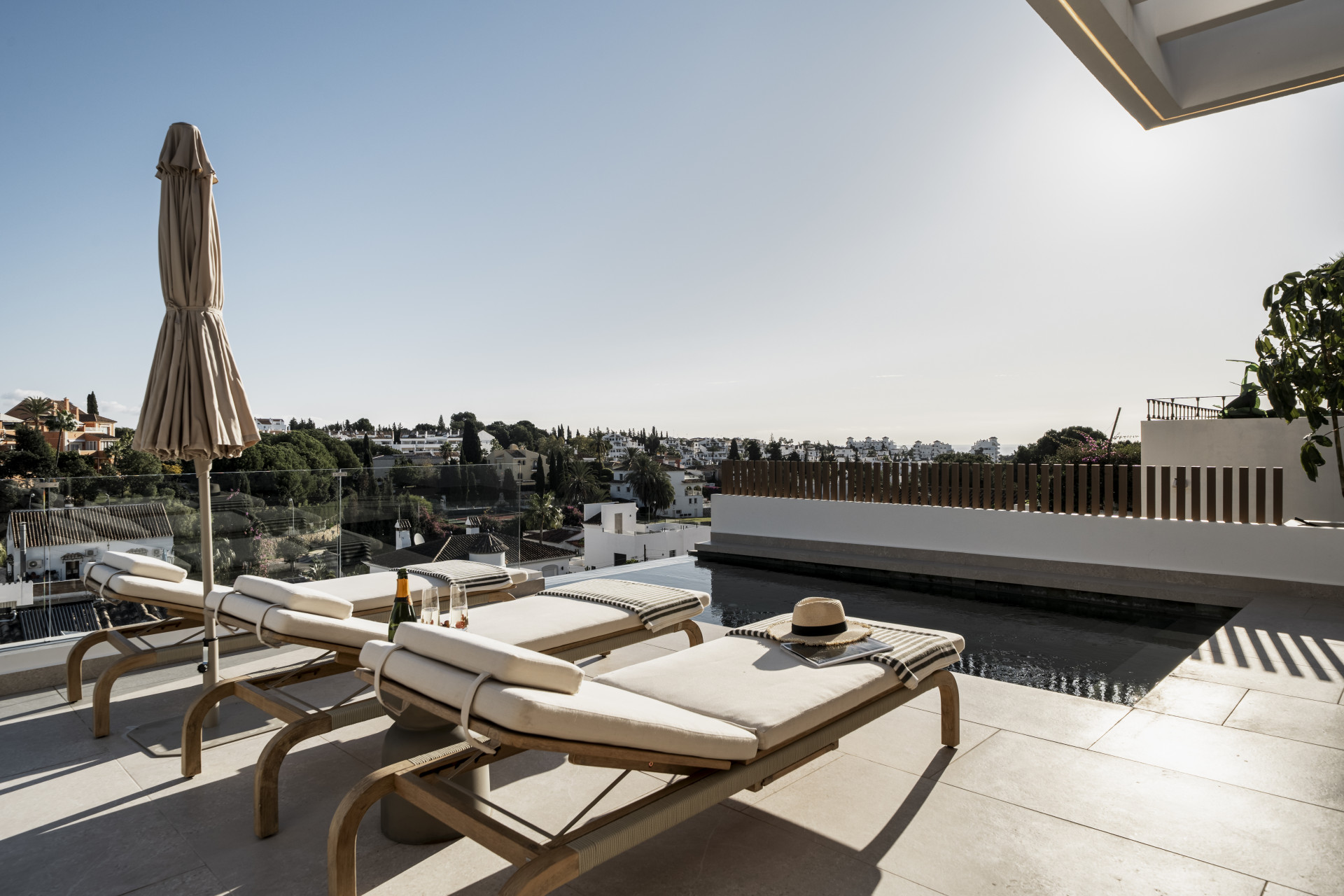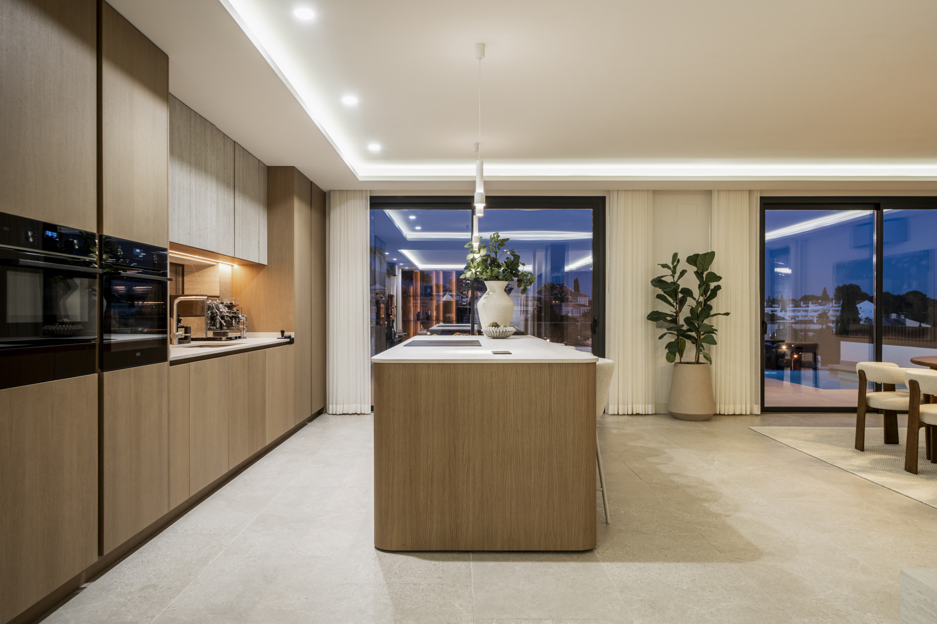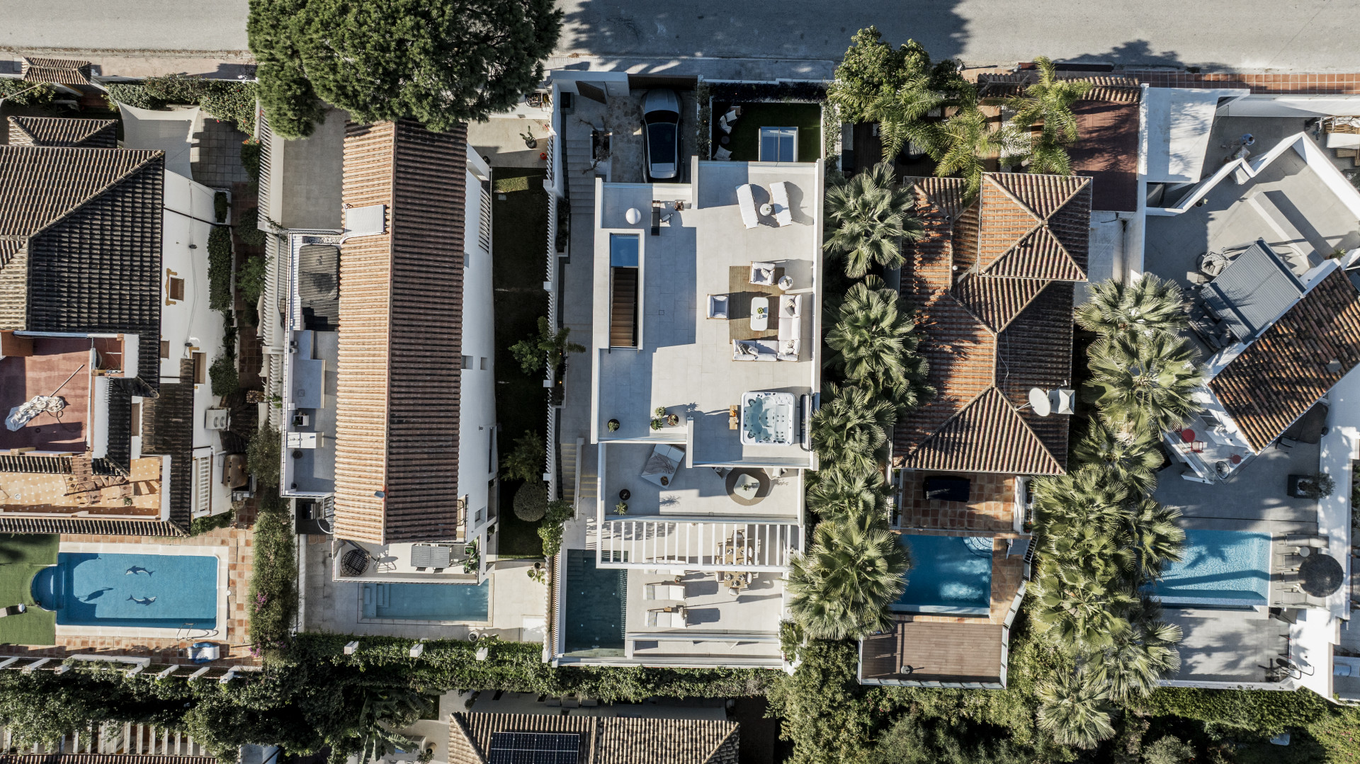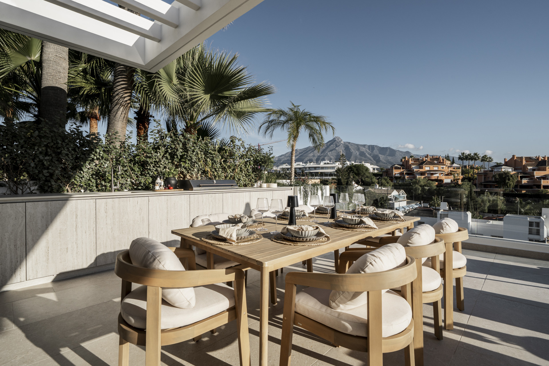 Ubicada en una posición elevada en Nueva Andalucía, Villa Tulua ofrece impresionantes vistas panorámicas desde La Concha, atravesando el Valle del Golf hasta Gibraltar y el Mediterráneo. Bañada por la luz natural gracias a su orientación este-oeste, esta villa completamente renovada combina una artesanía de alta calidad con un diseño elegante y funcional distribuido en tres niveles, con cinco dormitorios y cuatro baños. La planta principal se centra en una zona de estar de concepto abierto con cocina, comedor y salón que se extienden hacia una terraza con cocina exterior y piscina privada, todo enmarcado por vistas espectaculares. Una terraza en la azotea con jacuzzi ofrece panorámicas de 360 grados, mientras que la planta inferior alberga un apartamento totalmente independiente con entrada y terraza privadas, ideal para invitados o para generar ingresos por alquiler. Los interiores combinan suelos de porcelanato, madera a medida y piedra natural para crear un ambiente cálido y contemporáneo, complementado por una cochera, sistema de alarma y una ubicación tranquila. A pesar de su entorno apacible, la villa se encuentra cerca de servicios, campos de golf, playas, colegios internacionales y las atracciones de Puerto Banús y Marbella, ofreciendo un equilibrio ideal entre privacidad, estilo y funcionalidad.