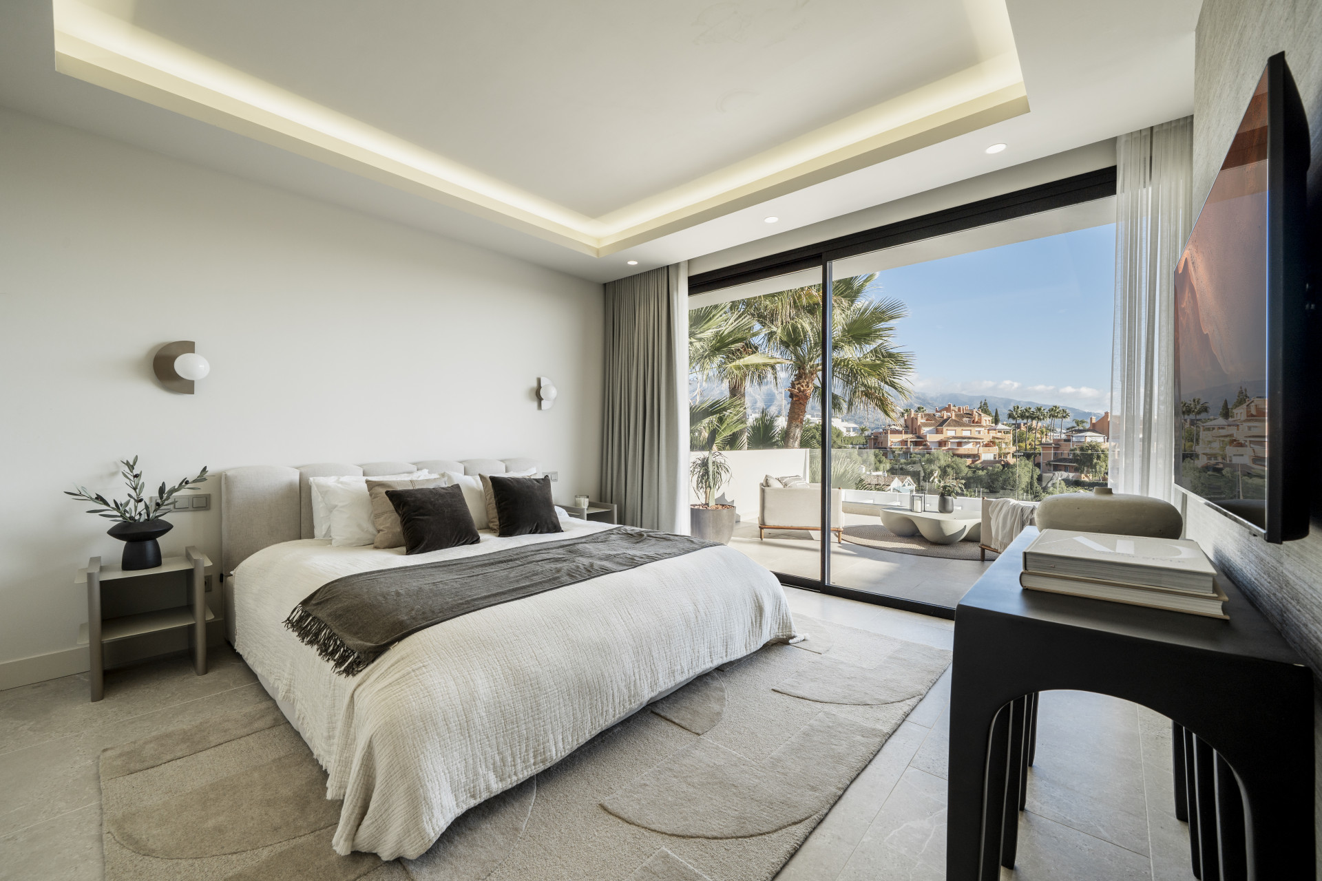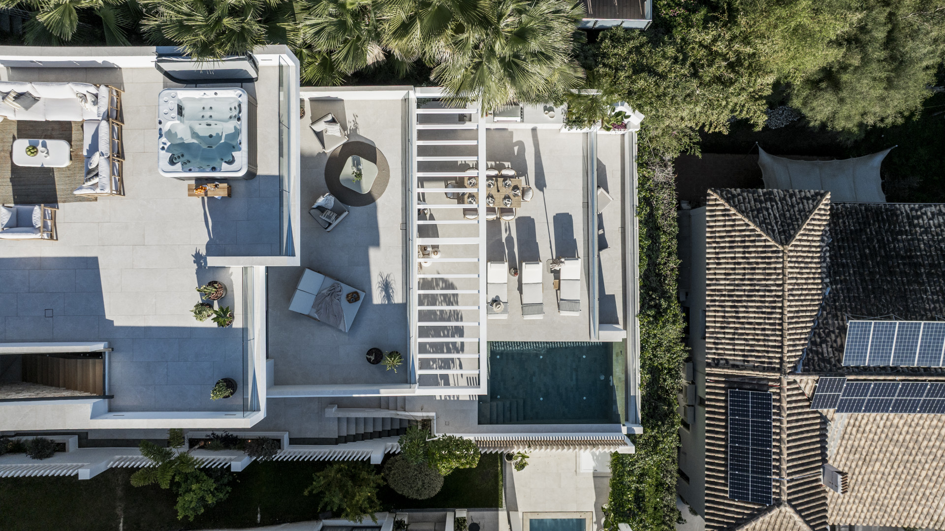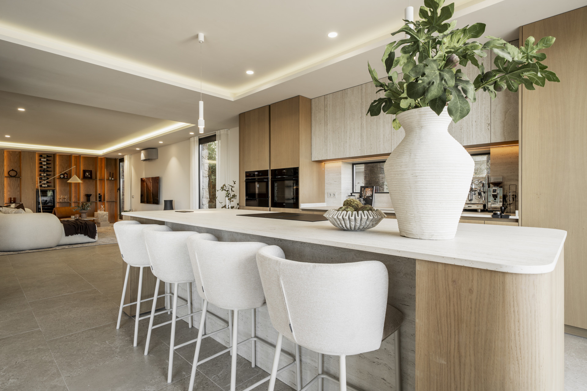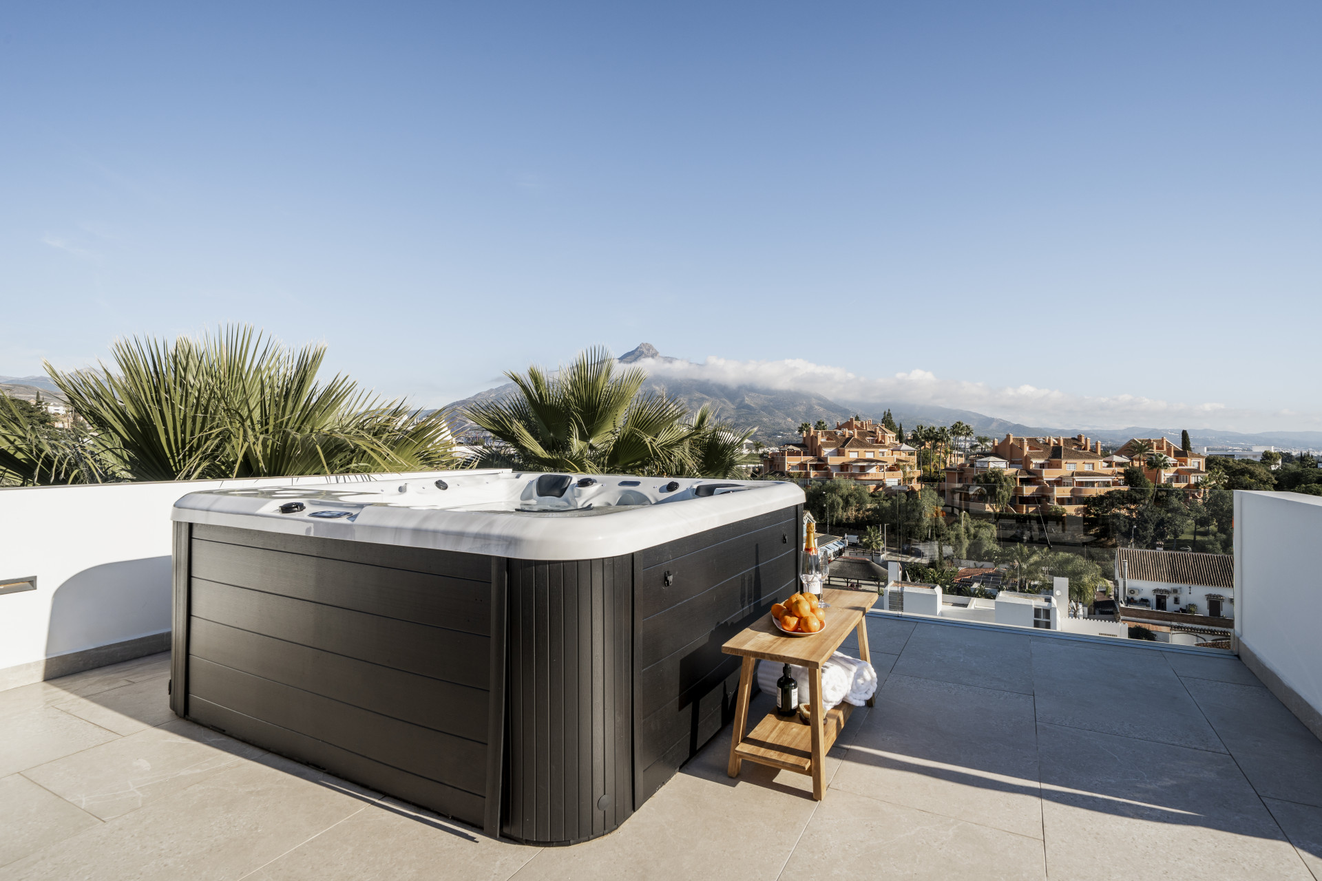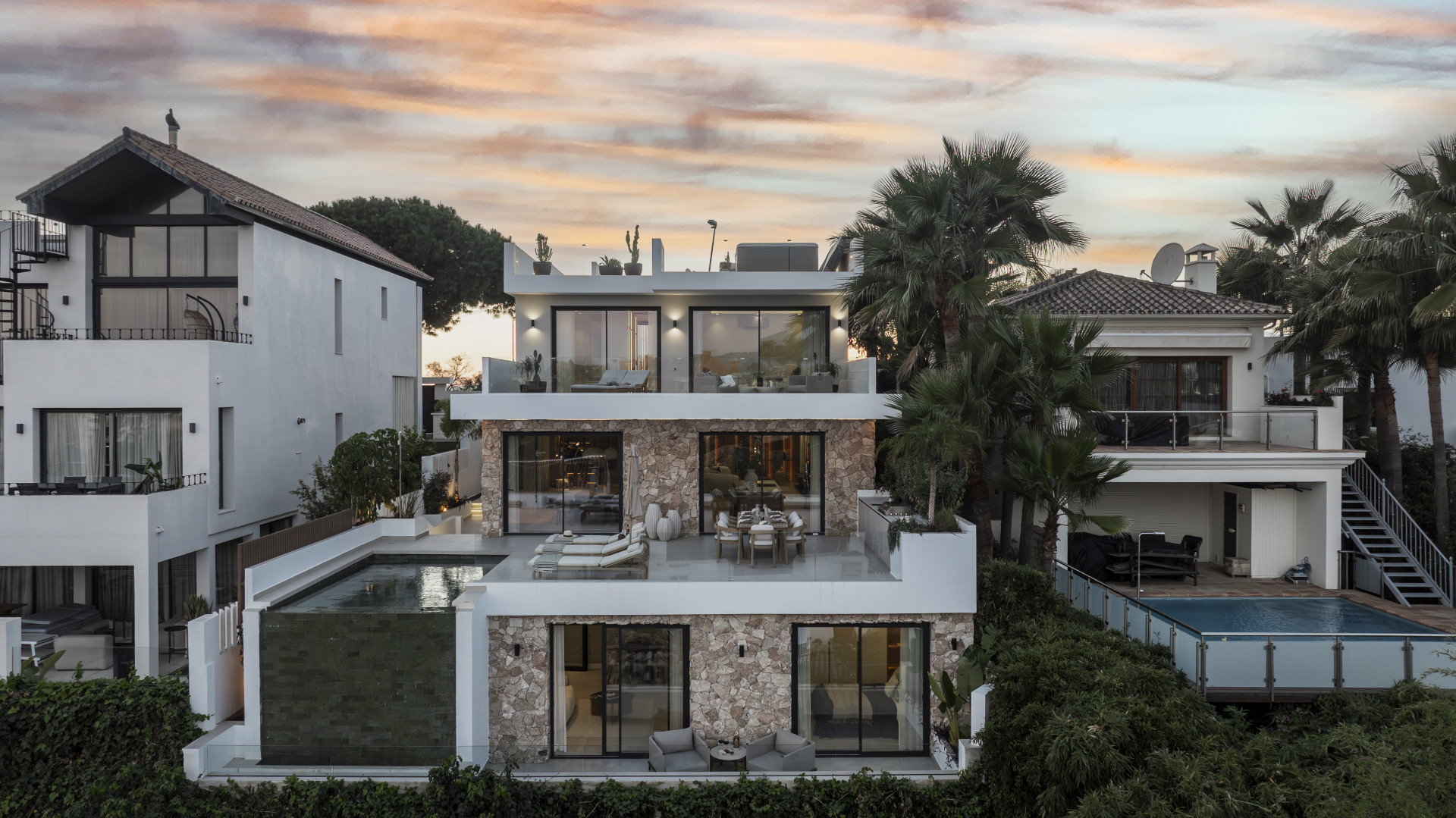 Ubicada en una posición elevada en Nueva Andalucía, Villa Tulua ofrece impresionantes vistas panorámicas desde La Concha, atravesando el Valle del Golf hasta Gibraltar y el Mediterráneo. Bañada por la luz natural gracias a su orientación este-oeste, esta villa completamente renovada combina una artesanía de alta calidad con un diseño elegante y funcional distribuido en tres niveles, con cinco dormitorios y cuatro baños. La planta principal se centra en una zona de estar de concepto abierto con cocina, comedor y salón que se extienden hacia una terraza con cocina exterior y piscina privada, todo enmarcado por vistas espectaculares. Una terraza en la azotea con jacuzzi ofrece panorámicas de 360 grados, mientras que la planta inferior alberga un apartamento totalmente independiente con entrada y terraza privadas, ideal para invitados o para generar ingresos por alquiler. Los interiores combinan suelos de porcelanato, madera a medida y piedra natural para crear un ambiente cálido y contemporáneo, complementado por una cochera, sistema de alarma y una ubicación tranquila. A pesar de su entorno apacible, la villa se encuentra cerca de servicios, campos de golf, playas, colegios internacionales y las atracciones de Puerto Banús y Marbella, ofreciendo un equilibrio ideal entre privacidad, estilo y funcionalidad.