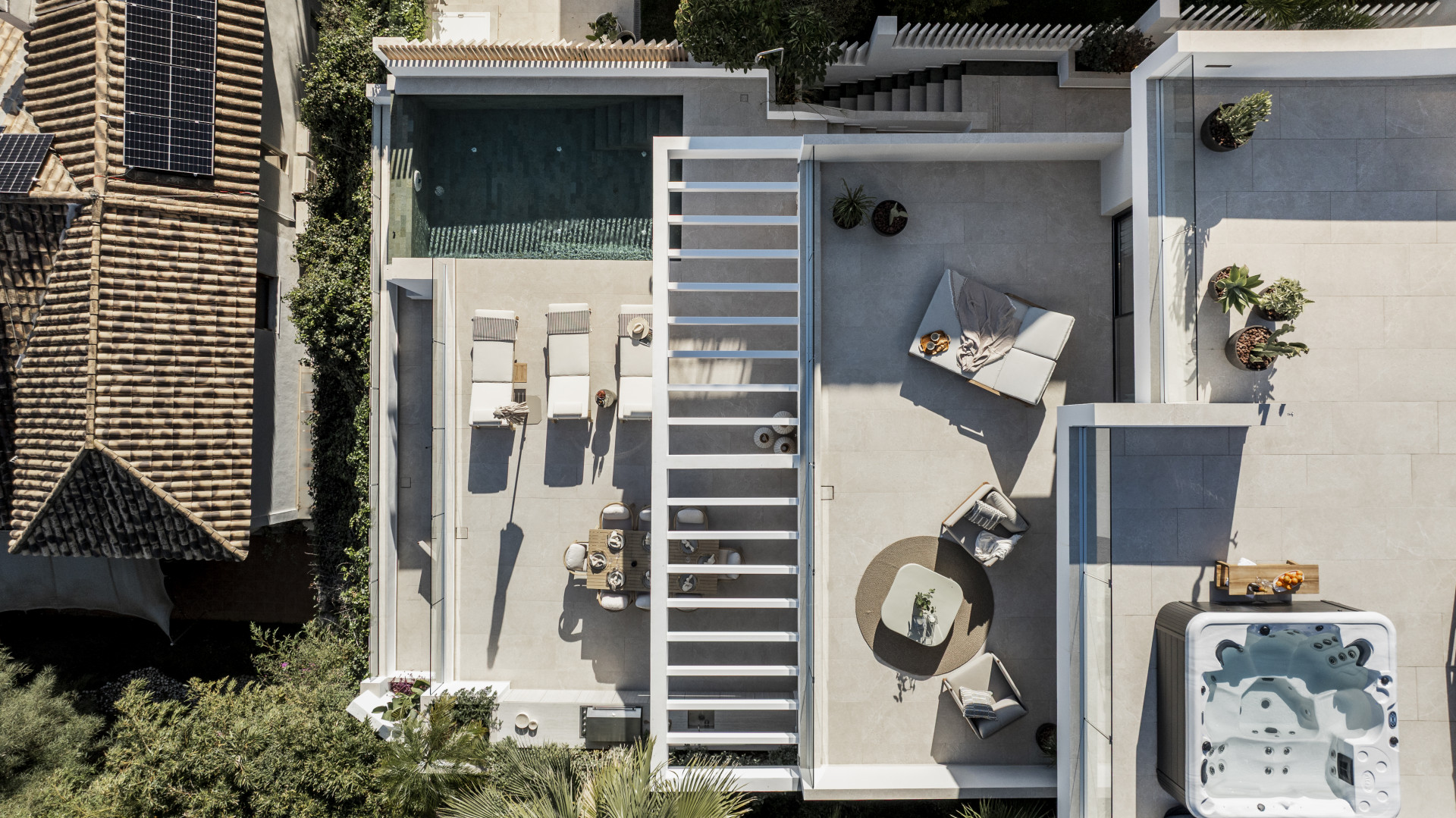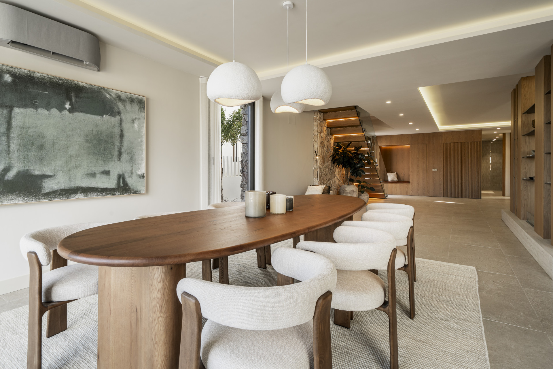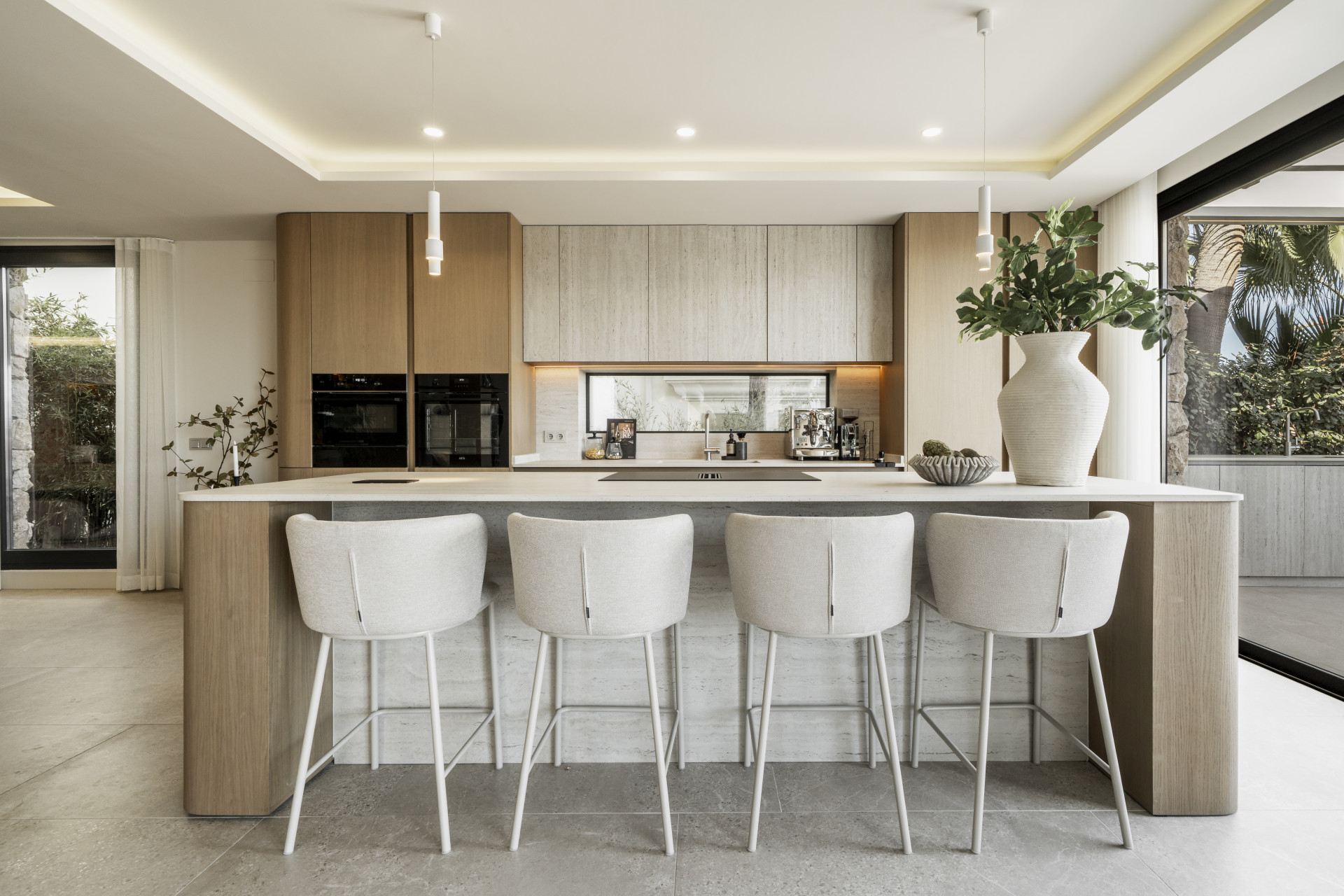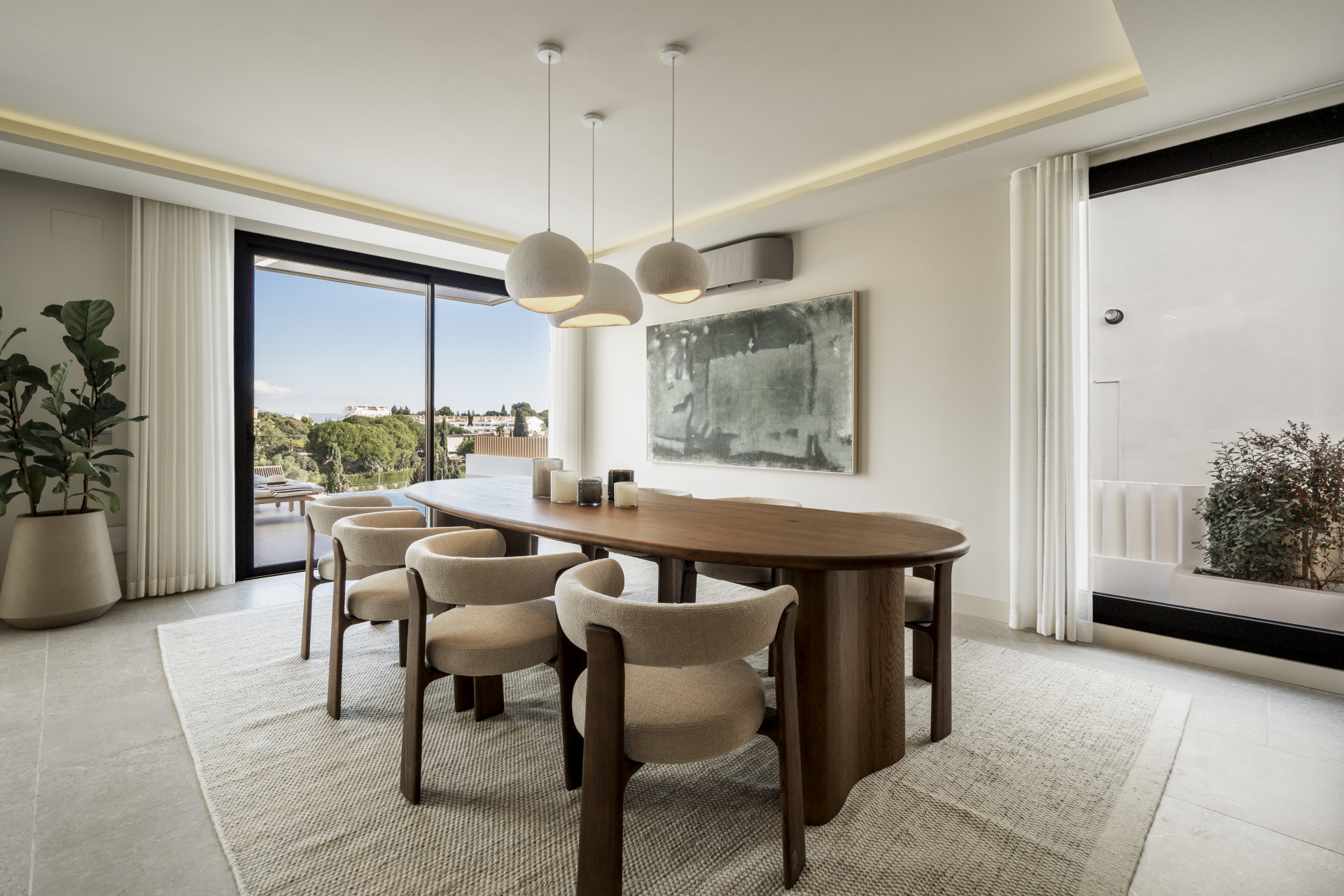 Ubicada en una posición elevada en Nueva Andalucía, Villa Tulua ofrece impresionantes vistas panorámicas desde La Concha, atravesando el Valle del Golf hasta Gibraltar y el Mediterráneo. Bañada por la luz natural gracias a su orientación este-oeste, esta villa completamente renovada combina una artesanía de alta calidad con un diseño elegante y funcional distribuido en tres niveles, con cinco dormitorios y cuatro baños. La planta principal se centra en una zona de estar de concepto abierto con cocina, comedor y salón que se extienden hacia una terraza con cocina exterior y piscina privada, todo enmarcado por vistas espectaculares. Una terraza en la azotea con jacuzzi ofrece panorámicas de 360 grados, mientras que la planta inferior alberga un apartamento totalmente independiente con entrada y terraza privadas, ideal para invitados o para generar ingresos por alquiler. Los interiores combinan suelos de porcelanato, madera a medida y piedra natural para crear un ambiente cálido y contemporáneo, complementado por una cochera, sistema de alarma y una ubicación tranquila. A pesar de su entorno apacible, la villa se encuentra cerca de servicios, campos de golf, playas, colegios internacionales y las atracciones de Puerto Banús y Marbella, ofreciendo un equilibrio ideal entre privacidad, estilo y funcionalidad.